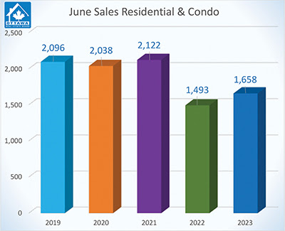 Members of the Ottawa Real Estate Board (OREB) sold 1,658 residential properties in June through the Board’s Multiple Listing Service® (MLS®) System, compared with 1,493 in June 2022, an increase of 11%. June’s sales included 1,234 in the freehold-property class, up 10% from a year ago, and 424 in the condominium-property category, a 16% increase from June 2022. The five-year average for total unit sales in June is 1,881.