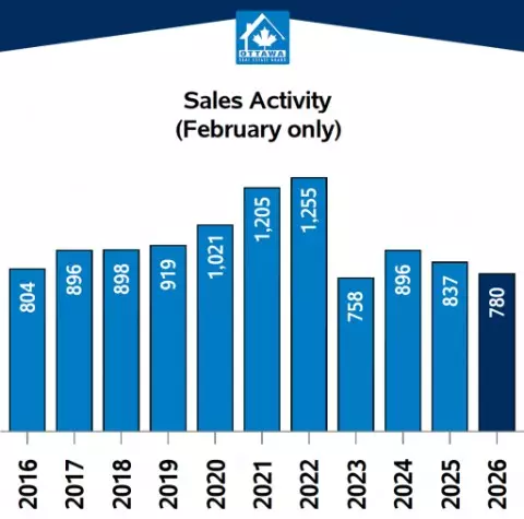 Ottawa’s residential market continued its winter slowdown in February, with overall sales remaining well below the five-year average of 990 transactions for the month. The slowdown, however, is not uniform across segments, and the data tells a more nuanced story than the headline numbers suggest.