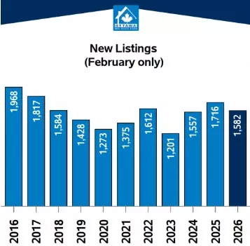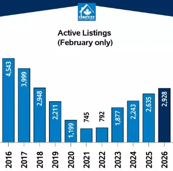 New listings in February totalled 1,582, down 7.8% from February 2025 but up from January’s 1,522. Active listings reached 2,928 units at month end, an increase of 11.1% year over year and well above levels seen in recent February periods.